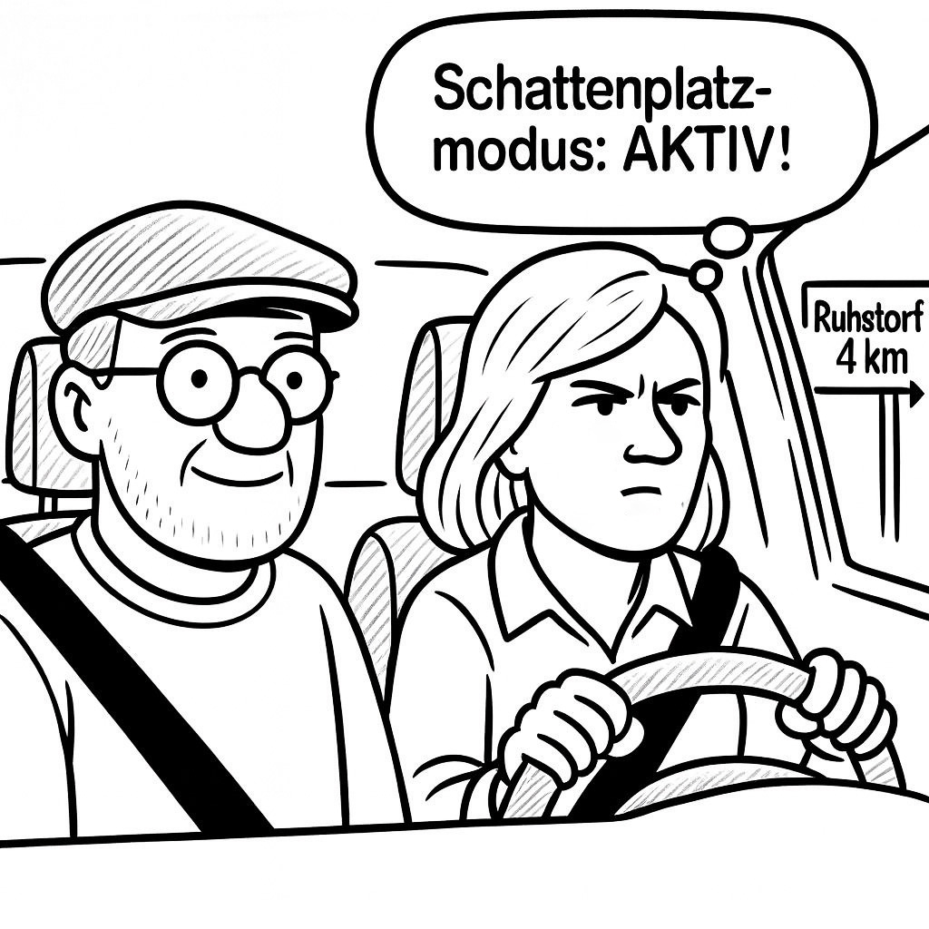 „Da links wär’ jetzt schon gut gewesen, oder suchst du nach einem Schattenparkplatz?“